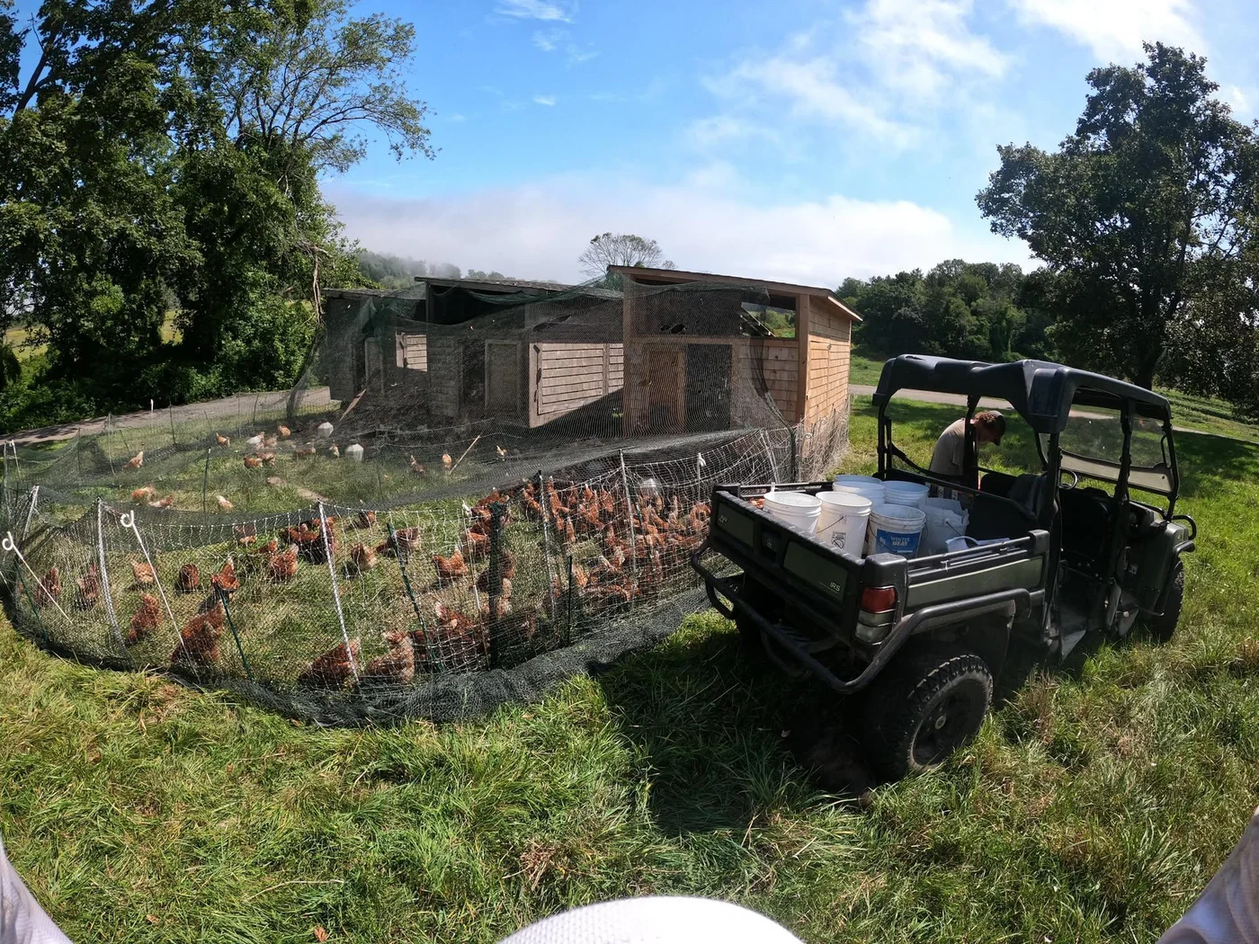 The chicken coop setup has been evolving over time. The mobile versions are inspired by regenerative farmer Joel Salatin of Polyface Farm. While he did not invent the concept of a mobile coop, his innovative use of these portable structures to move chickens across pastures has made them a central feature of regenerative farming.