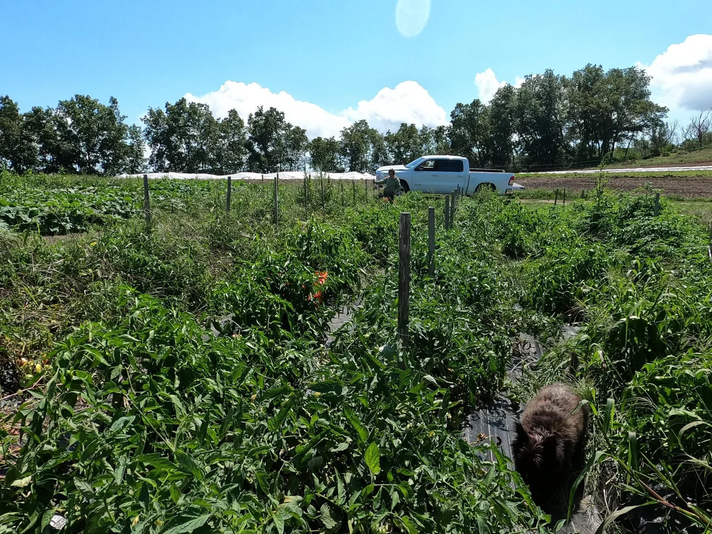Today we moved the chicken coops, harvested tomatoes, and applied row cover. There was a power outage and some of our work had to be delayed, but with a small crew maybe the timing was best that way.