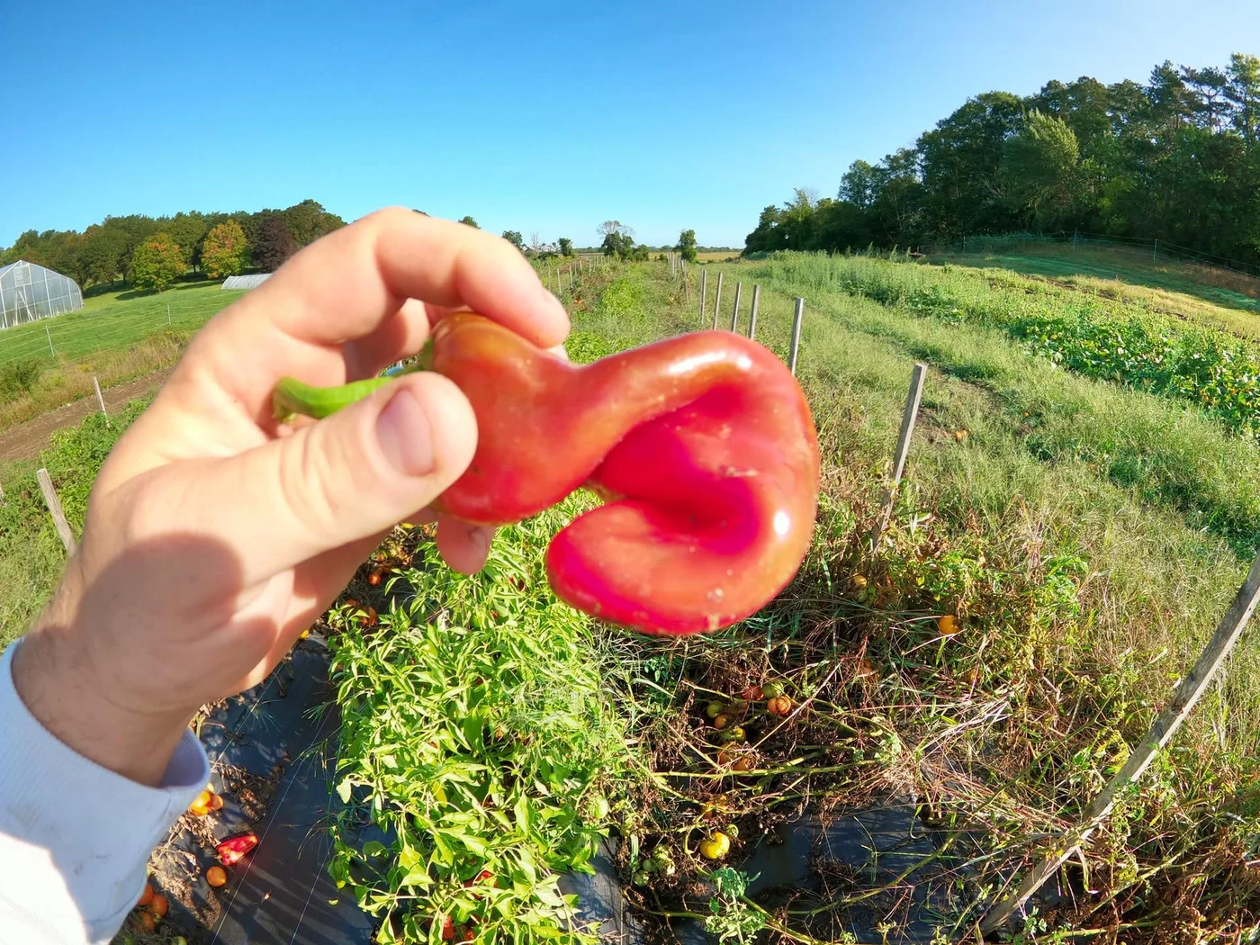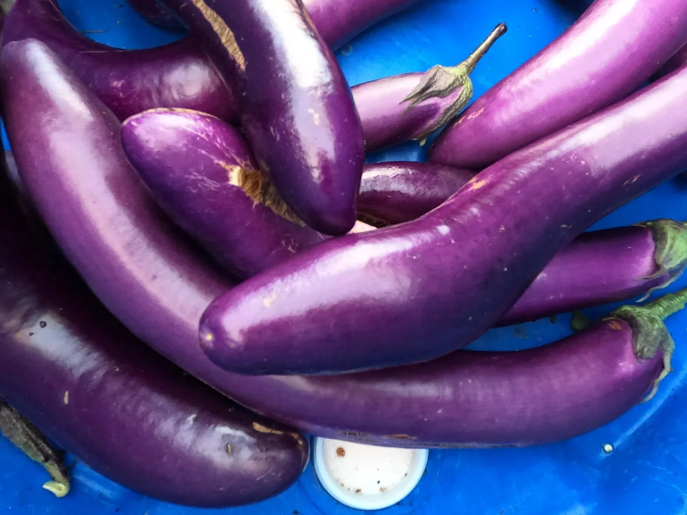 - Harvested red Italia peppers, Carmen peppers, eggplants, and slicer tomatoes.