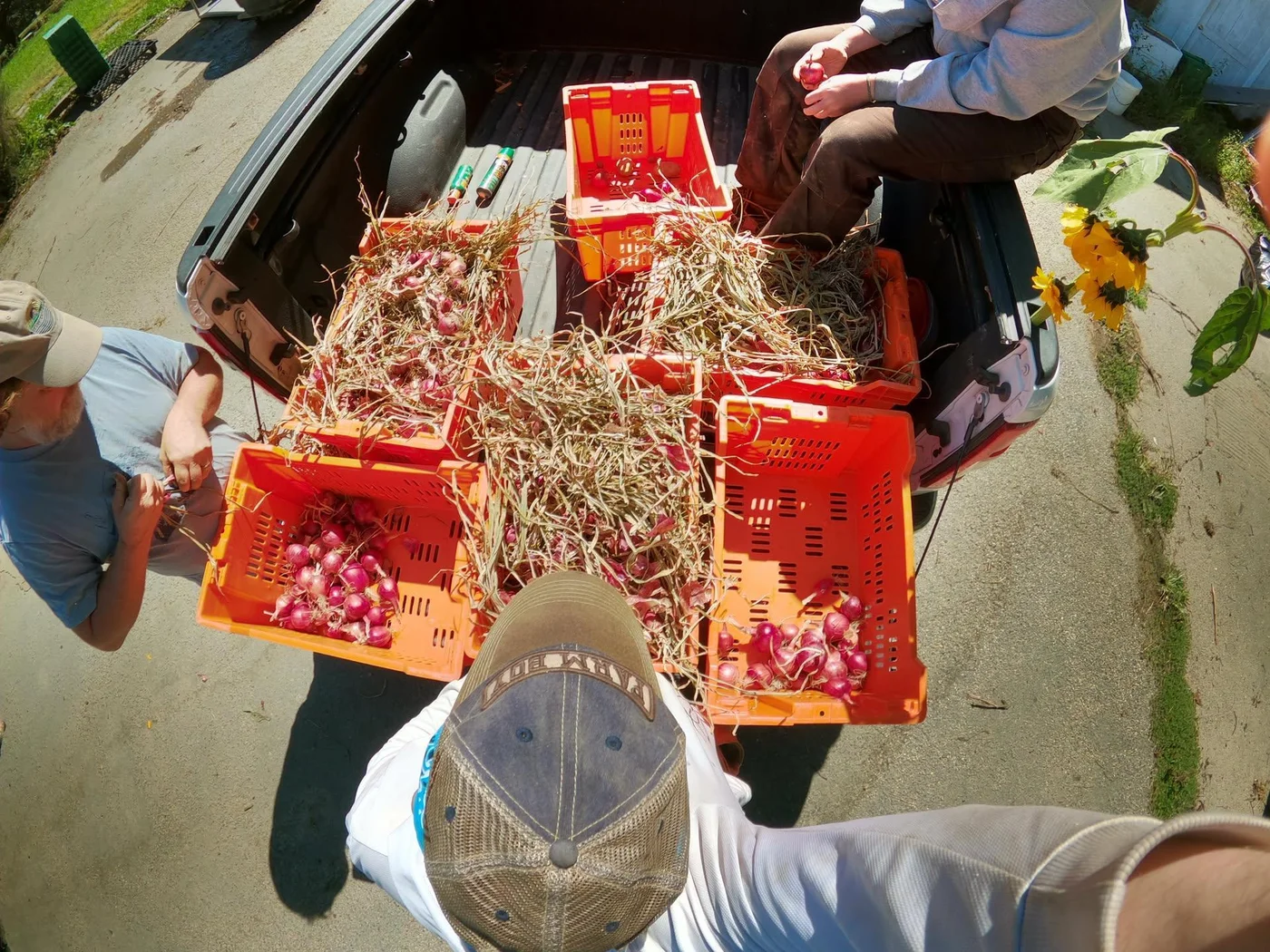 - Onion Processing in Orange Bins: Drying red onions in orange bins and processing them for the barn.