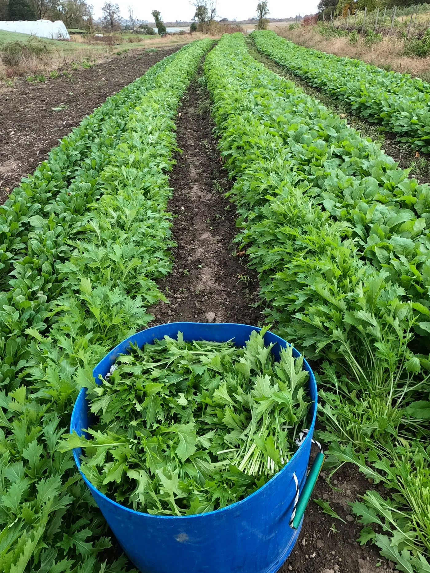As discussed in earlier posts, harvesting mizuna is super easy. Because of its stalky nature, a simple harvest knife (or the personal curved one I use) makes quick work of it. I like to think that I’m shaving the field when I use short, rapid cuts down a row but obviously I’m not a professional farm stylist so I can’t claim that this is any sort of best practice.