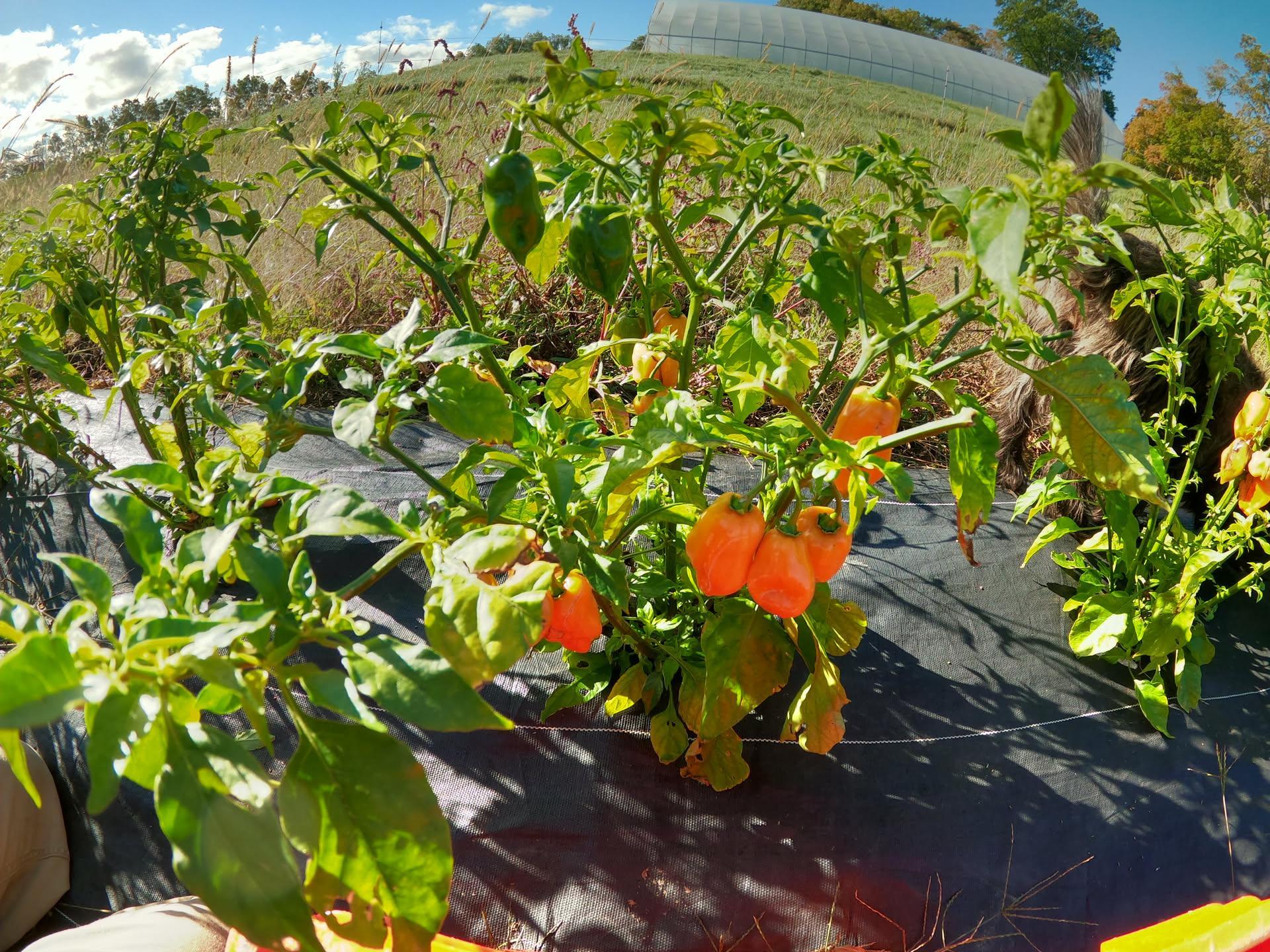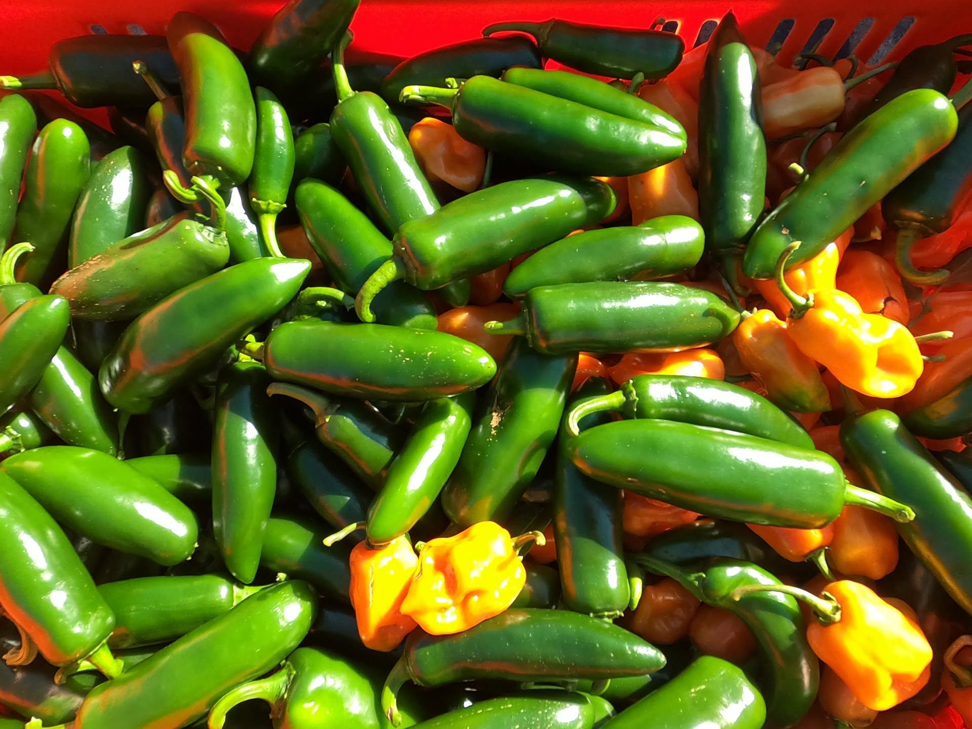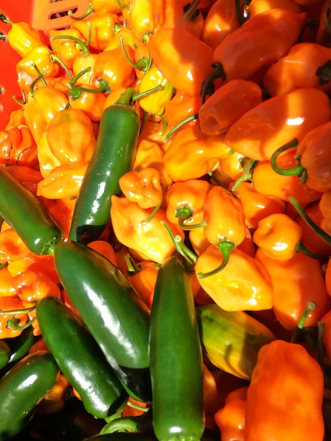 - Harvested two orange bin-sized bins of hot peppers (types: Hungarian hot wax, flaming flare, jalapeno, habanero).